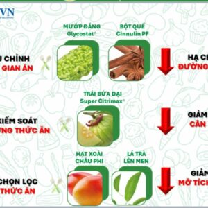 Sản phẩm là sự hội tụ các thành phần quý giá chiết xuất từ quả mướp đắng (khổ qua), trái bứa dại (trái đằng hoành), tinh bột quế, hạt xoài châu Phi, lá trà lên men… Được phát triển & sản xuất bởi các nhà khoa học – bác sĩ người Mỹ. Sản phẩm đạt được cấp bằng sáng chế về tính độc quyền & chuyên biệt của từng nguyên liệu, được chứng minh hiệu quả lâm sàng về: