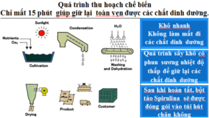 * Công nghệ tiên tiến sản xuất tảo rất khoa học. (từ khi vớt Tảo xoắn(spirulina) VỚT – TÁCH NƯỚC – DÂY CHUYỀN XẤY KHÔ – XAY MỊN – ĐÓNG GÓI thành phẩm chỉ mất 15 phút